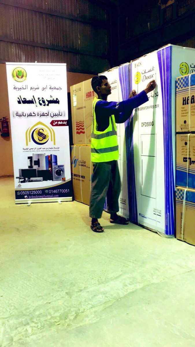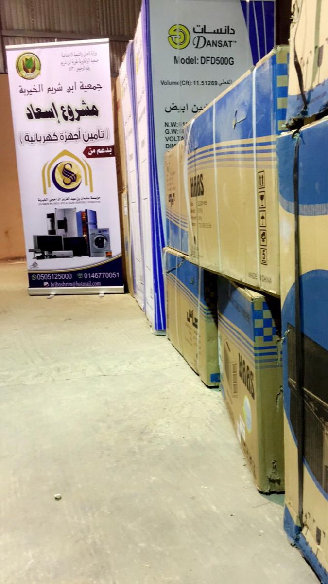 قامت جمعيه ابن شريم الخيرية بتوزيع أجهزة كهربائية متنوعة للأسر الأكثر آحتياجاً من بين مستفيديها وذلك بدعم : من مؤسسة سليمان بن عبدالعزيز الراجحي الخيرية .
