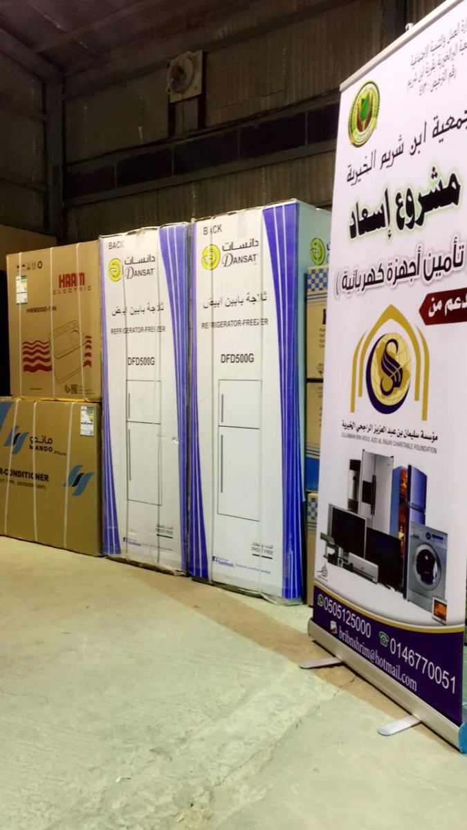 الجمعية أنهت اليوم توزيع الآجهزه الكهربائية المنزليه المتنوع واشتملت على مكيفات و غسالات ملابس كهربائية وثلاجات كبيرة وأفران .